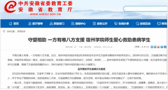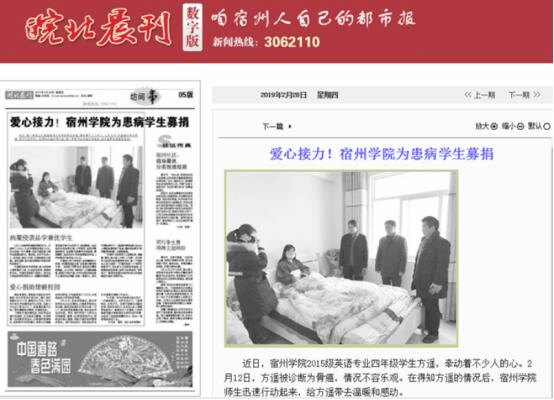全校师生爱心救助患病学生。2月27日至28日,《安徽教育网》、《中安在线》、《安青网》、《皖北晨刊》分别以《守望相助 一方有难八方支援 宿州学院师生爱心救助患病学生》、《宿州学院师生为患病学生献爱心》、《宿州学院凝聚爱心温暖患病学生》、《爱心接力!宿州学院为患病学生募捐》为标题,对我校师生爱心救助患病学生方遥的事件进行了报道。