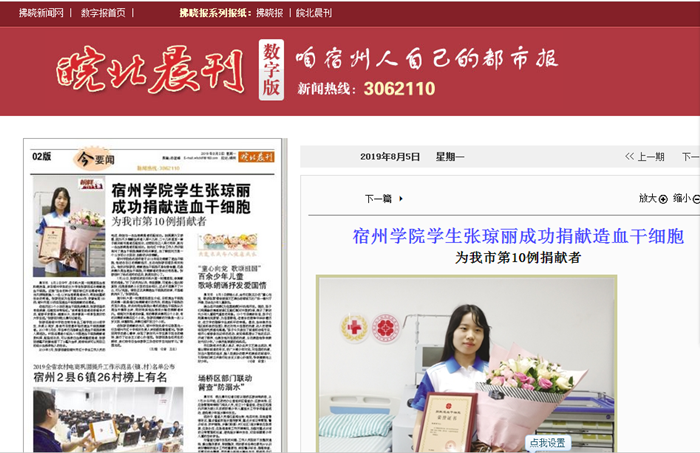 8月5日,《皖北晨刊》《拂晓新闻网》以《宿州学院学生张琼丽成功捐献造血干细胞》为题,对我校受助学生张琼丽成功捐献造血干细胞的先进事迹进行了报道。同日,《安徽教育网》也以《挽救12岁女孩 宿州学院一女生捐献造血干细胞》为题,对张琼丽同学捐献的事迹进行了报道。