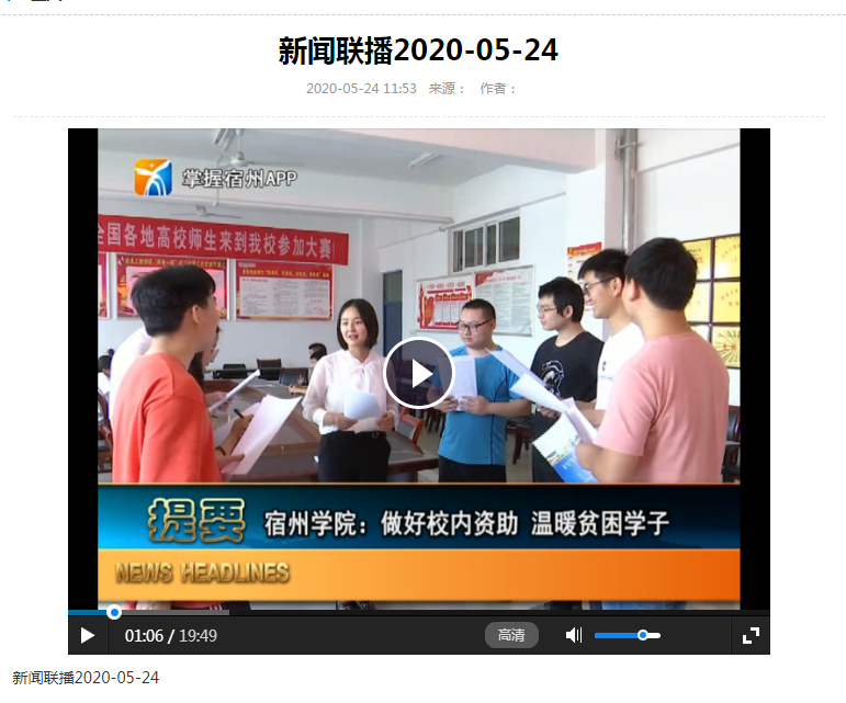 524,宿州电视台新闻联播以《宿州学院:做好校内资助温暖贫困学子》为题对我校不断增强“精准资助”的工作理念,配好资助专干和辅导员,着力做好校内资助工作,取得了明显的成效的消息进行了报道。
