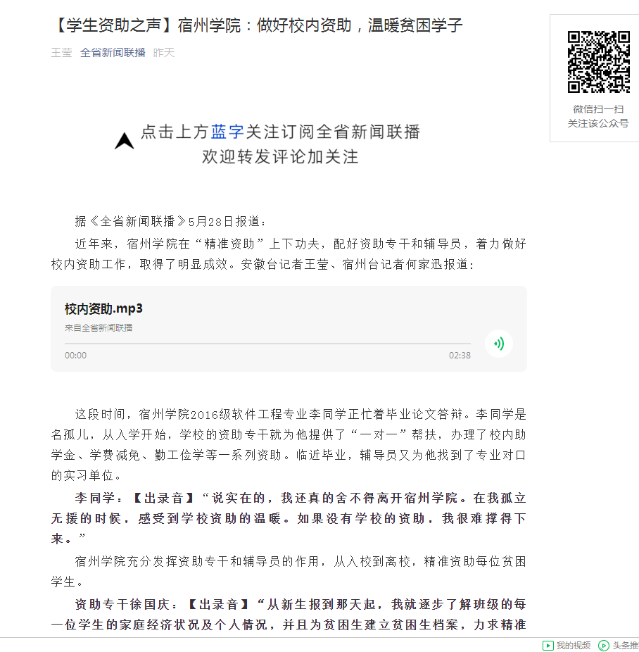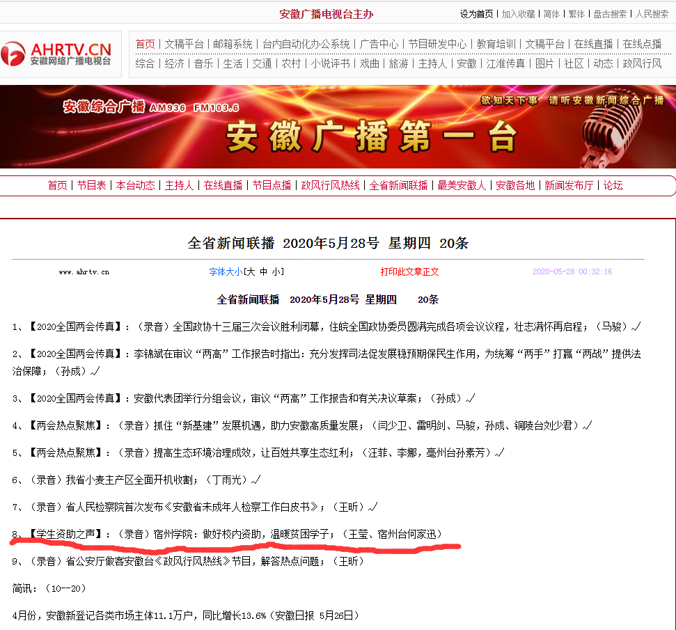 528日,《安徽新闻综合广播》(FM103.6/AM936)《全省新闻联播》栏目以《宿州学院:做好校内资助,温暖贫困学子》为题,对我校多措并举,认真做好学生资助工作的消息进行了报道。
