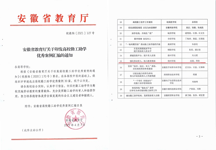近日,安徽省教育厅下发《关于印发高校勤工助学优秀案例汇编的通知》(皖教秘〔2021〕127号),我院选送的勤工助学案例《强化劳动育人 助力教育资助》被遴选为安徽省高校勤工助学优秀案例,在全省高校推广学习。
