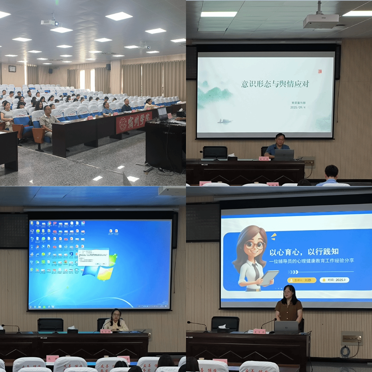会上,宣传部、保卫处、就业与校地合作处就高校意识形态工作与舆情应对、学生安全教育、职业生涯规划与就业工作指导等进行了详细解读,数学与统计学院刘静老师做辅导员工作经验交流。