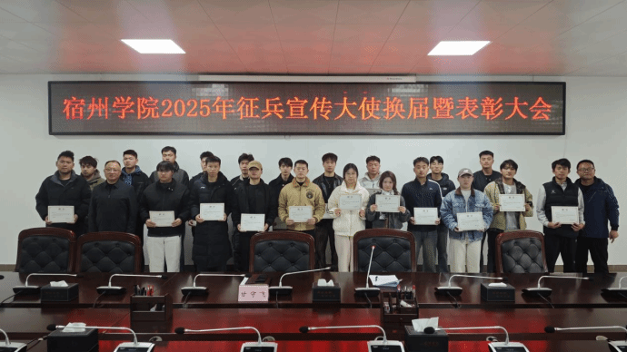 11月28日上午,宿州学院2025年征兵宣传大使换届暨表彰大会在逸夫楼第一会议室顺利召开。党委学生工部部长甘守飞、征兵工作负责人郭祥东及全体征兵宣传大使参会,会议由郭祥东主持。