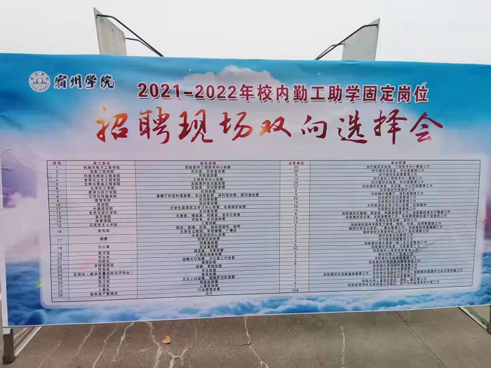 据统计,本次双选会共吸引全校1000多名同学参与,活动受到了广大同学和校内用工单位的一致好评,取得了圆满成功。下一步,学工部将组织用工单位与学生签订《宿州学院校内勤工助学协议书》,进一步规范校内勤工助学管理,推动我校学生勤工助学工作健康有序开展。