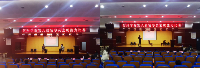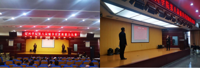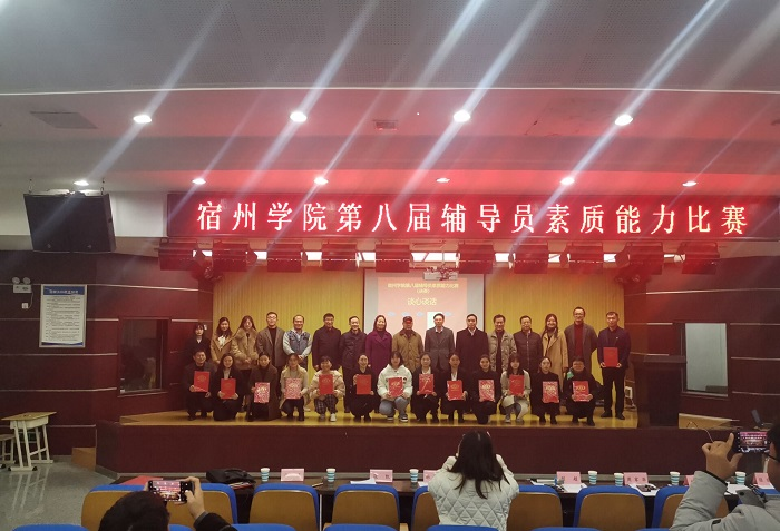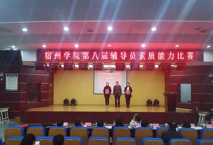 为进一步提高我校辅导员的理论水平、专业素养,推动辅导员队伍专业化职业化建设,12月9日宿州学院第八届辅导员素质能力比赛决赛在工科楼招聘就业大厅举行。比赛邀请宿州职业技术学院基础教学部副主任陈云玲、动科农艺系主任韩效磊,皖北卫生职业学院学生处处长张峰、公共基础部党委书记张凯,宿州学院马克思主义学院党委书记、院长刘超,图书馆馆长周家华,招生就业处处长杨刚,党委武装部副部长张晓聪,学生工作助理总队队长韦正升担任评委,刘超为评委组组长。宿州学院全体专兼职辅导员观摩了比赛,比赛由党委学工部学生管理科副科长夏梦雪主持。