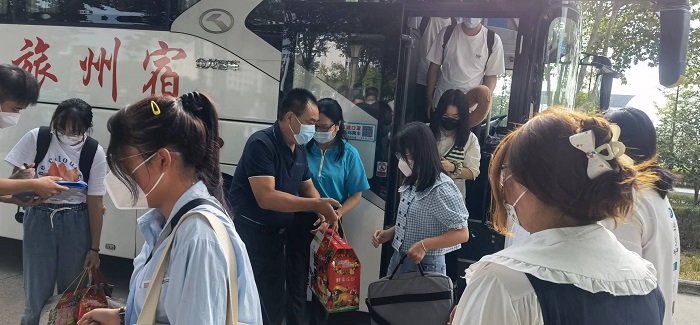 9月10日上午七点多开始到傍晚七点多结束,学校分两批次安排专车和辅导员前往5个隔离点,迎接隔离新生返校。到达校园后,学校为学生准备了中秋大礼包。