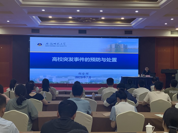 安徽师范大学学生工作处处长邵登辉做了题为“高校突发事件的预防与处置”的专题讲座。他强调,要聚焦安全稳定,实现危机事件闭环管理,教育为先,预防为主,依法依规,快速反应,内部协同,外部支持,依法治校,依法治教,依法管理。