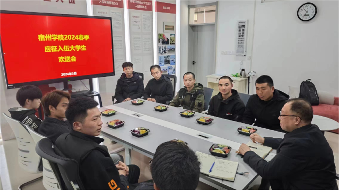 3月7日上午,宿州学院2024年春季应征入伍大学生欢送会在逸夫楼征兵工作站举行。学工部部长甘守飞,征兵工作站负责人,退役优秀学生代表及入伍学生参加欢送会。