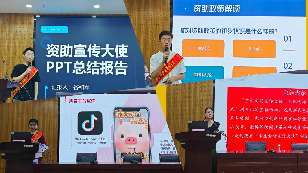 最后,优秀学生资助宣传大使做实践内容汇报;周宇为同学们作学生资助政策培训,重点介绍宣传大使的工作任务和要求,为他们做好资助宣传打实基础。