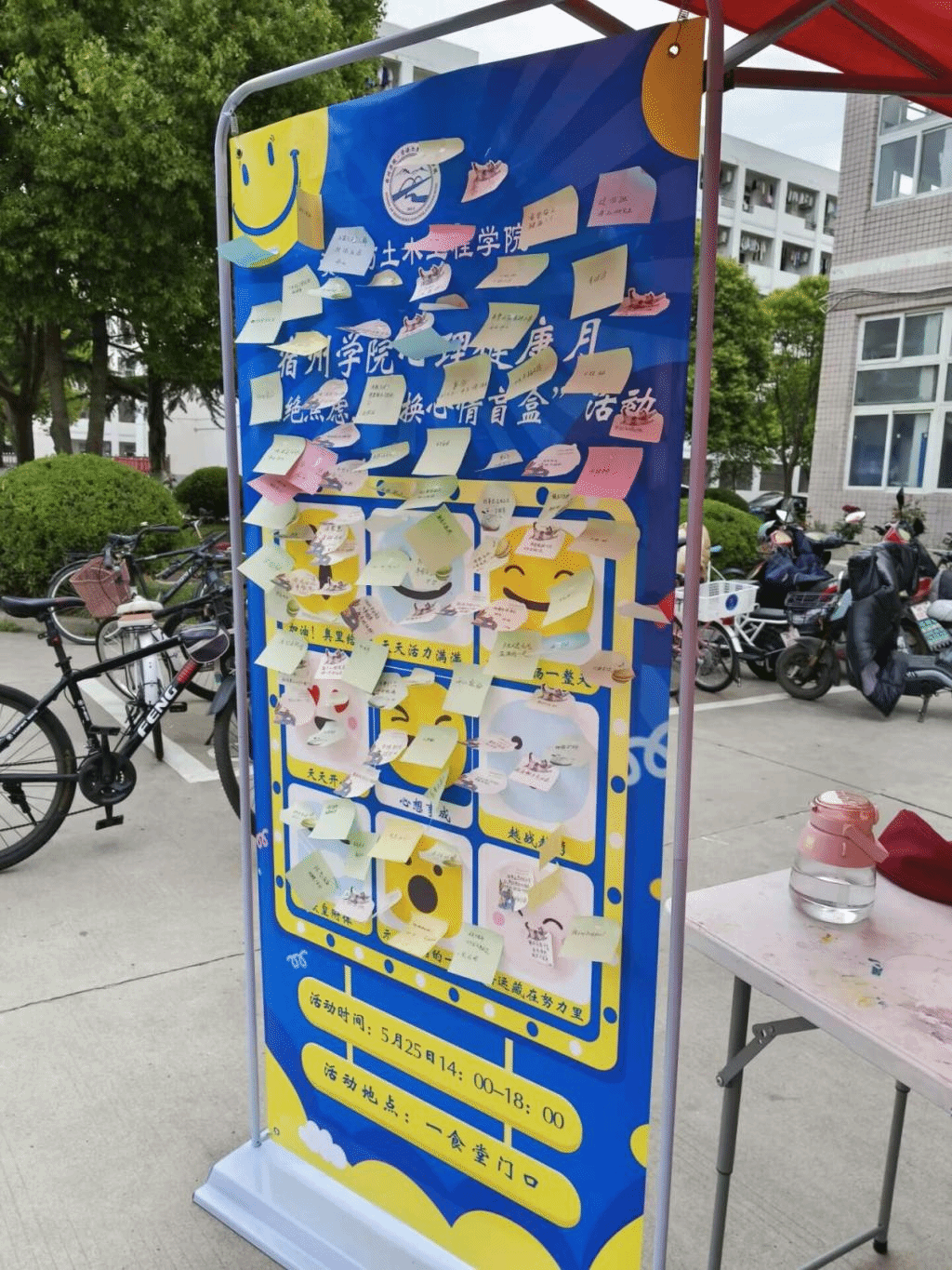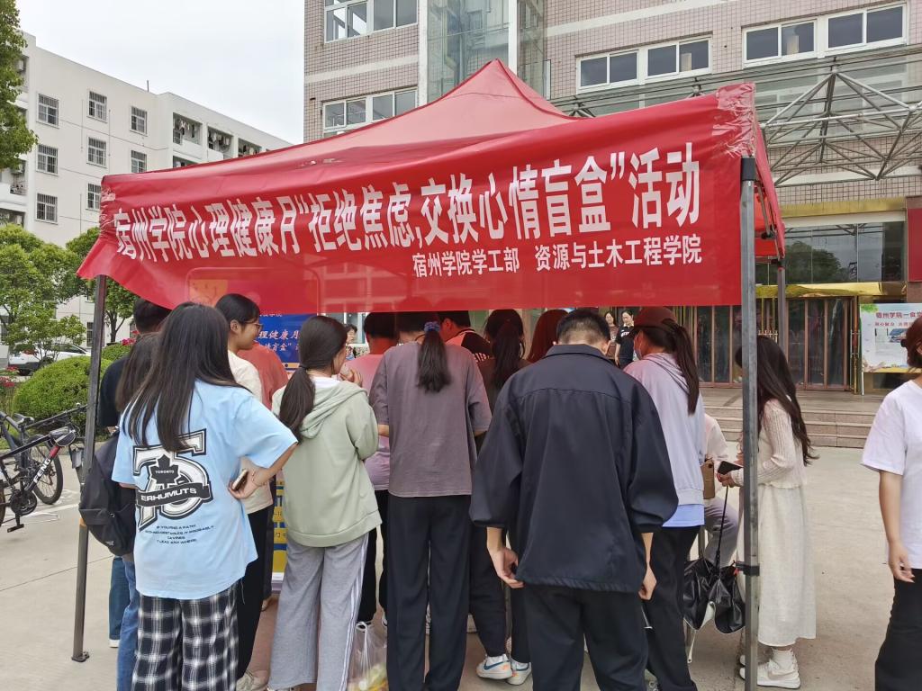 5月25日是全国大学生心理健康日,为了丰富大学生的业余文化生活,加强校园精神文明建设,促进大学生身心健康发展。5月25日下午,由宿州学院学工部主办,资源与土木工程学院承办的“拒绝焦虑 交换心情盲盒”活动在第一食堂门口举行。