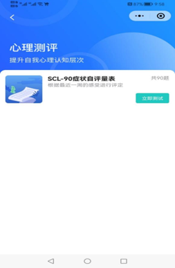3、点击主页“心理测评”,点击立即测试,按照要求做完后提交,完成测试。